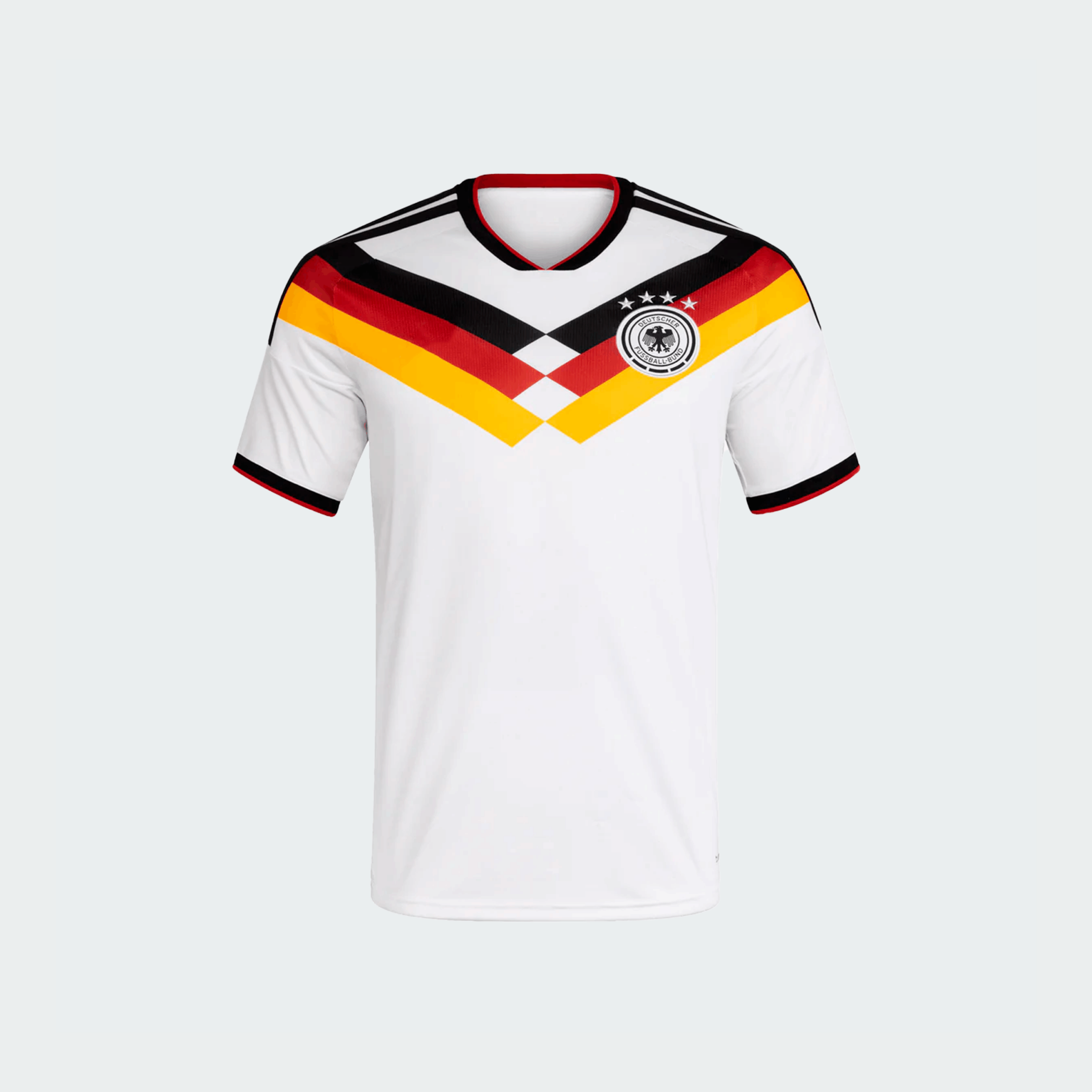 La camiseta local de Alemania para el ciclo actual, utiliza el blanco clásico como base principal. Su elemento de diseño más destacado es un gráfico en los hombros que fusiona los colores de la bandera alemana (negro, rojo y amarillo) en un degradado que se asemeja a las alas de un águila, símbolo de la Federación Alemana de Fútbol (DFB).