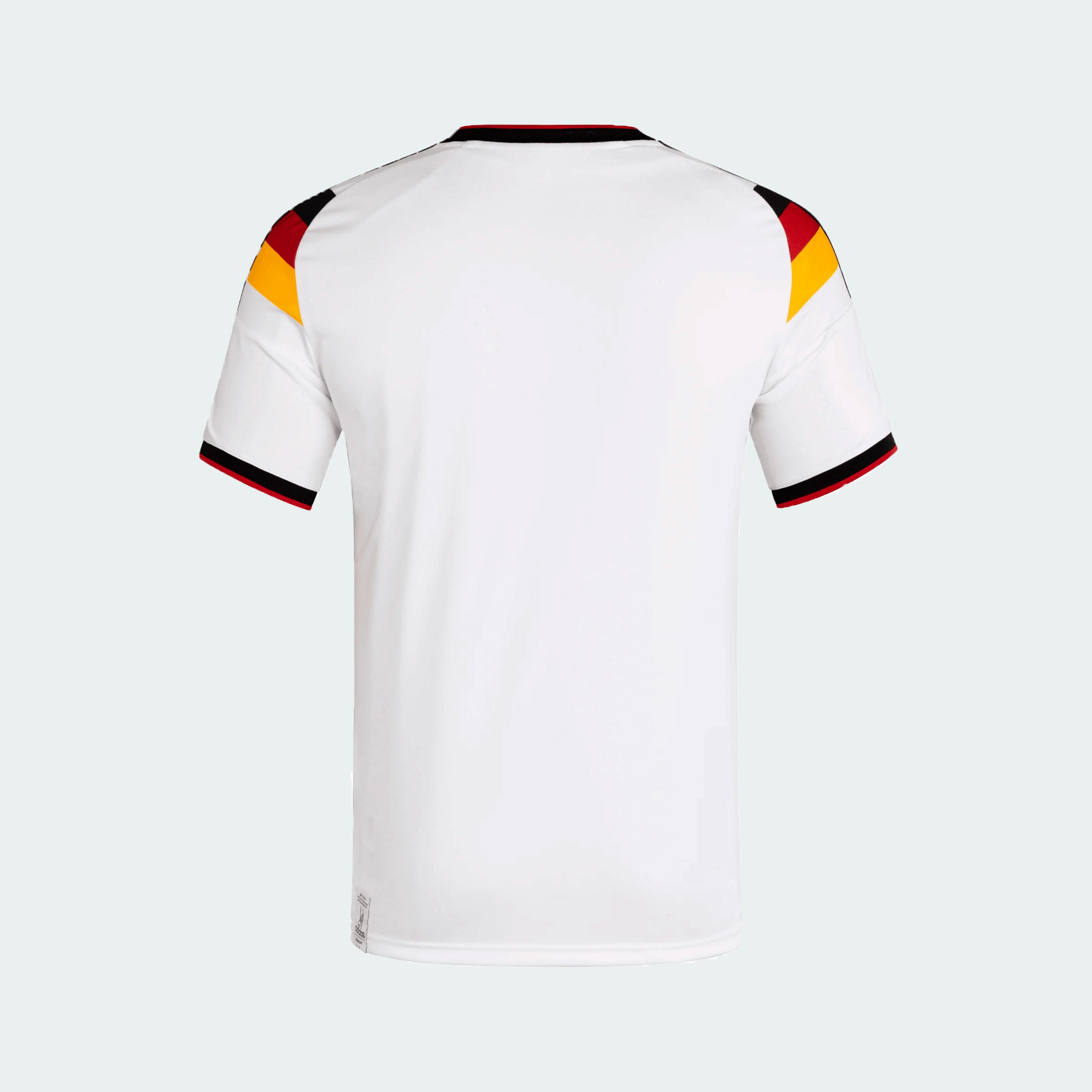La camiseta local de Alemania es blanca y presenta un llamativo degradado en los hombros con los colores de la bandera alemana (negro, rojo y amarillo), que simula las alas de un águila.