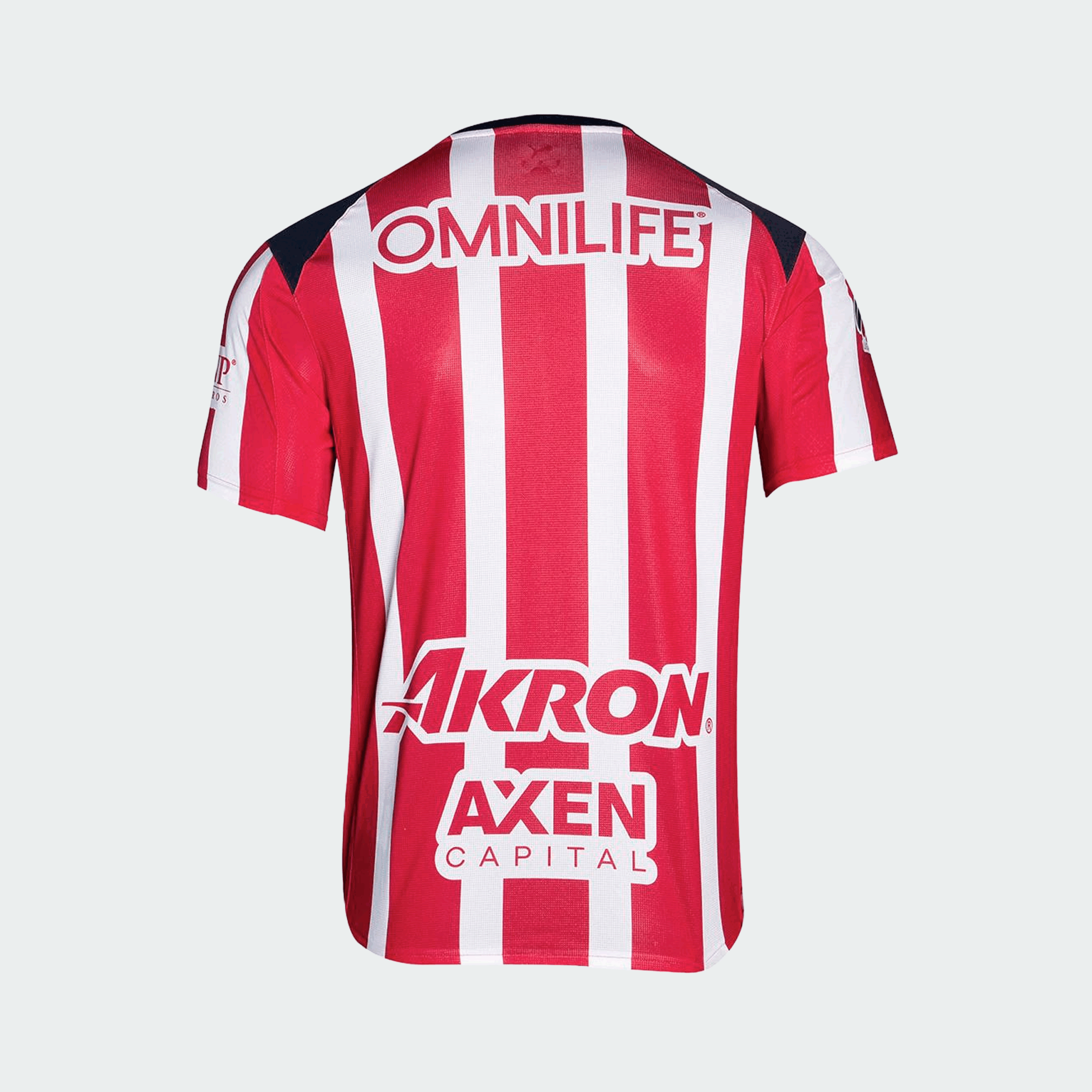 El jersey local de Chivas 2026 mantiene las franjas rojiblancas, destacando por sus múltiples patrocinadores y por acentos de color azul en el cuello redondo y los hombros.