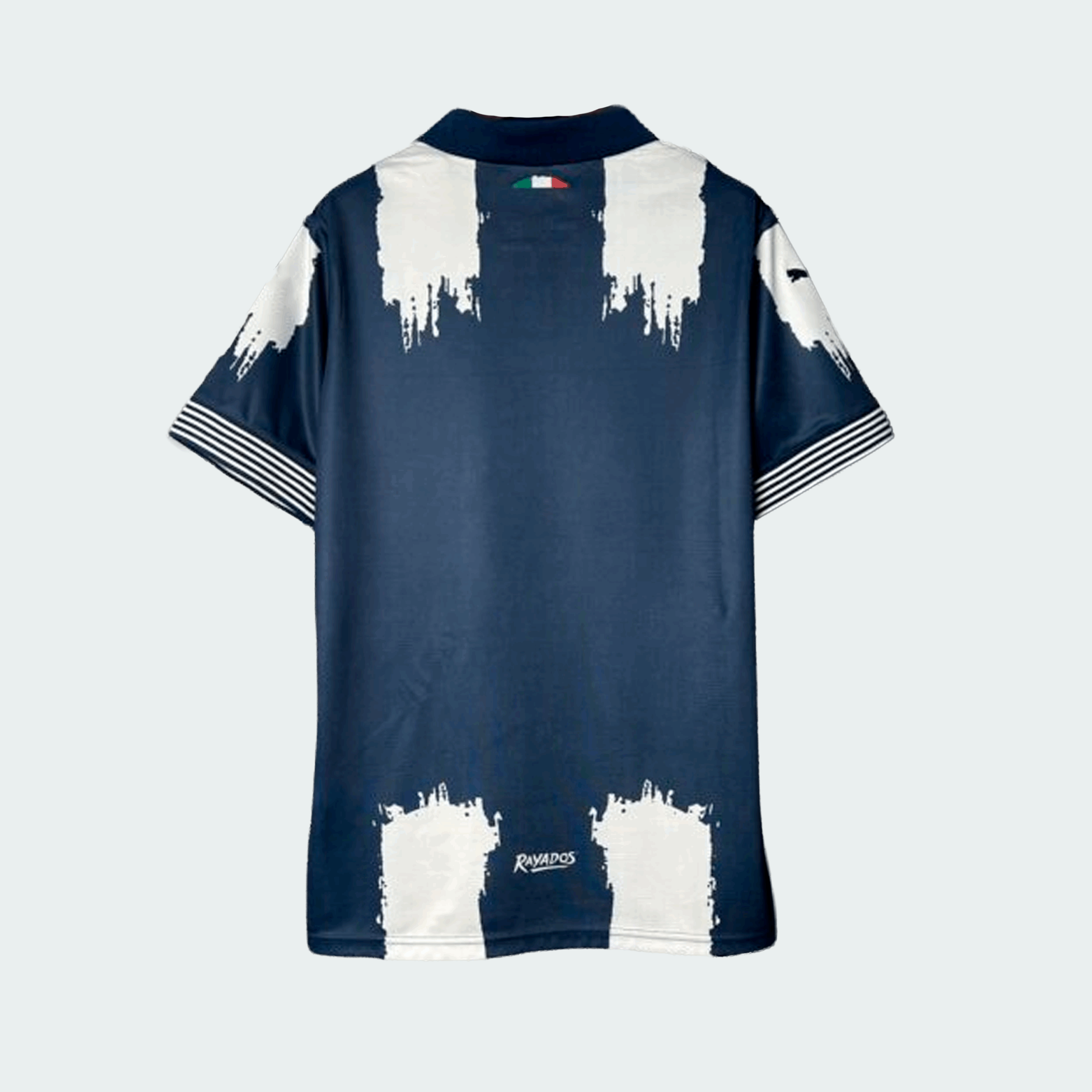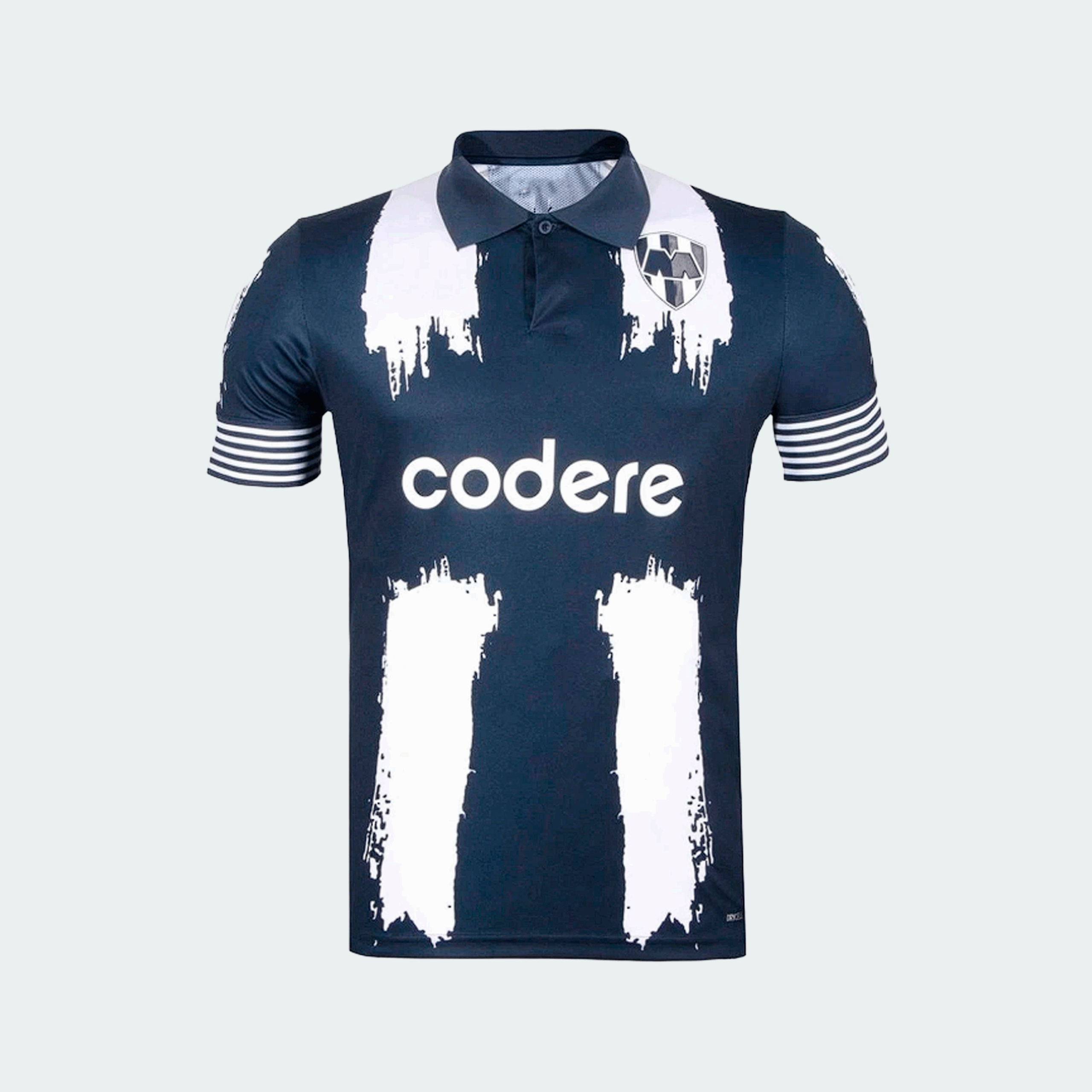 Esta camiseta, que sirve como tercer uniforme o equipación alternativa para el Club de Fútbol Monterrey, invierte el concepto de la camiseta de local. Utiliza una base de color oscuro (azul marino o antracita) y aplica el diseño de “brochazos” en color blanco, creando dos franjas verticales con un efecto de pintura desgastada.