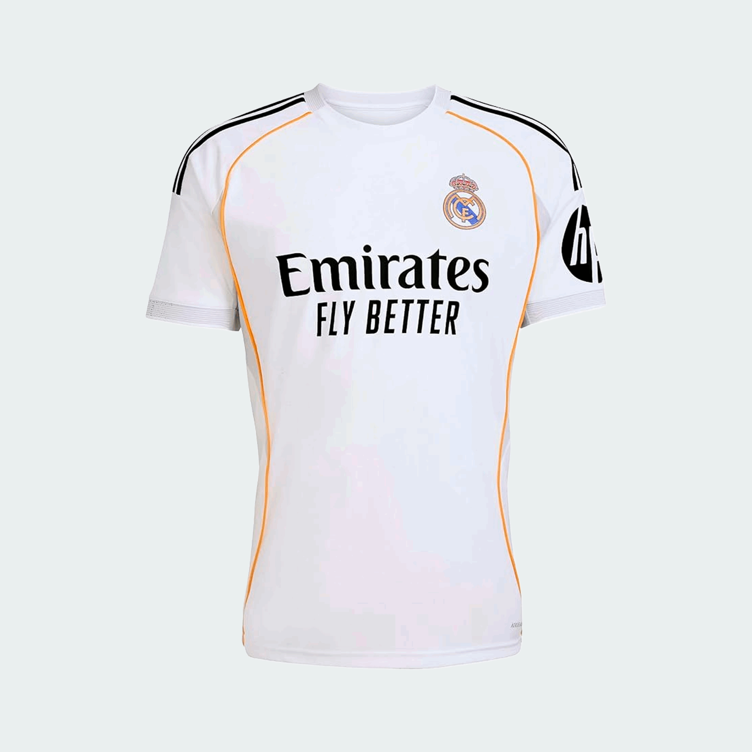 La camiseta local del Real Madrid para el ciclo 2026 mantiene su icónico color blanco como base. El diseño incorpora el negro para elementos clave como las tres franjas de los hombros, el patrocinador principal “Emirates Fly Better” en el pecho y el nuevo patrocinador “HP” en la manga.