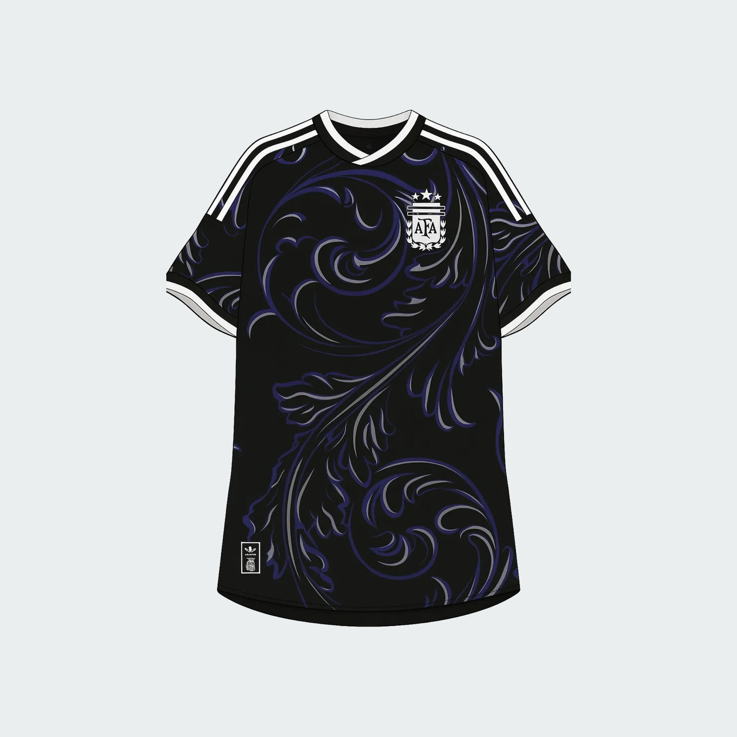 Acercándose al negro y violeta de años anteriores, Argentina regresa a un azul real intenso que evoca grandes recuerdos mundialistas. Combina elementos violetas y blancos en los costados y el escudo full blanco destaca sobre el fondo oscuro.